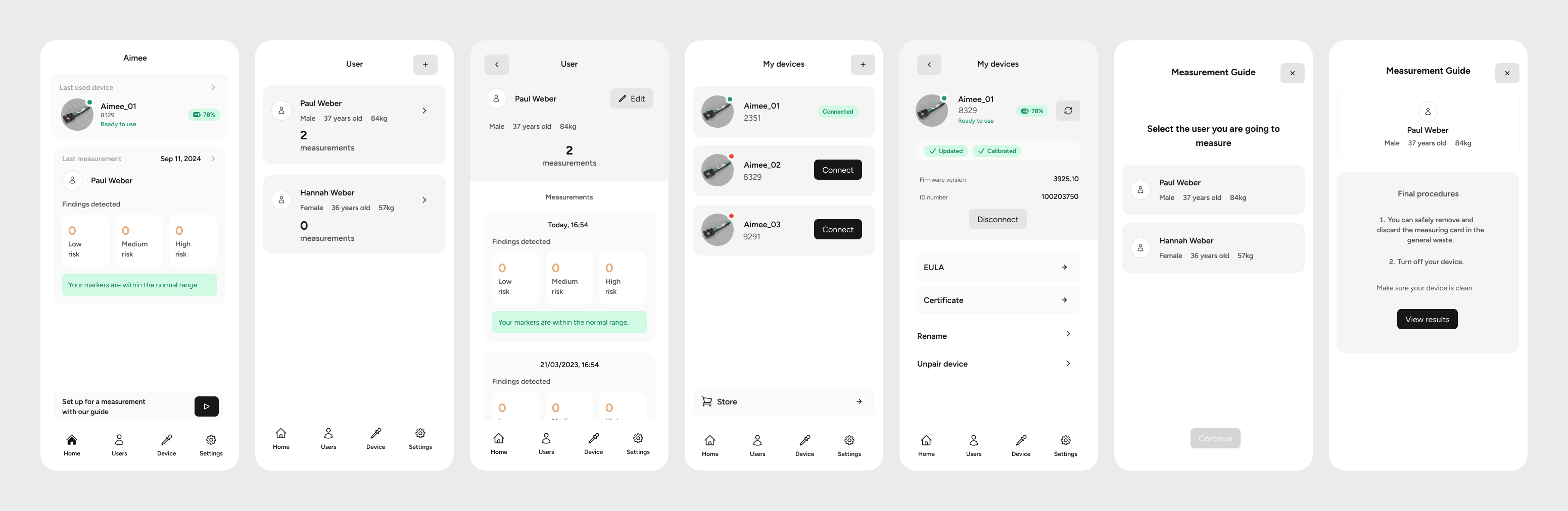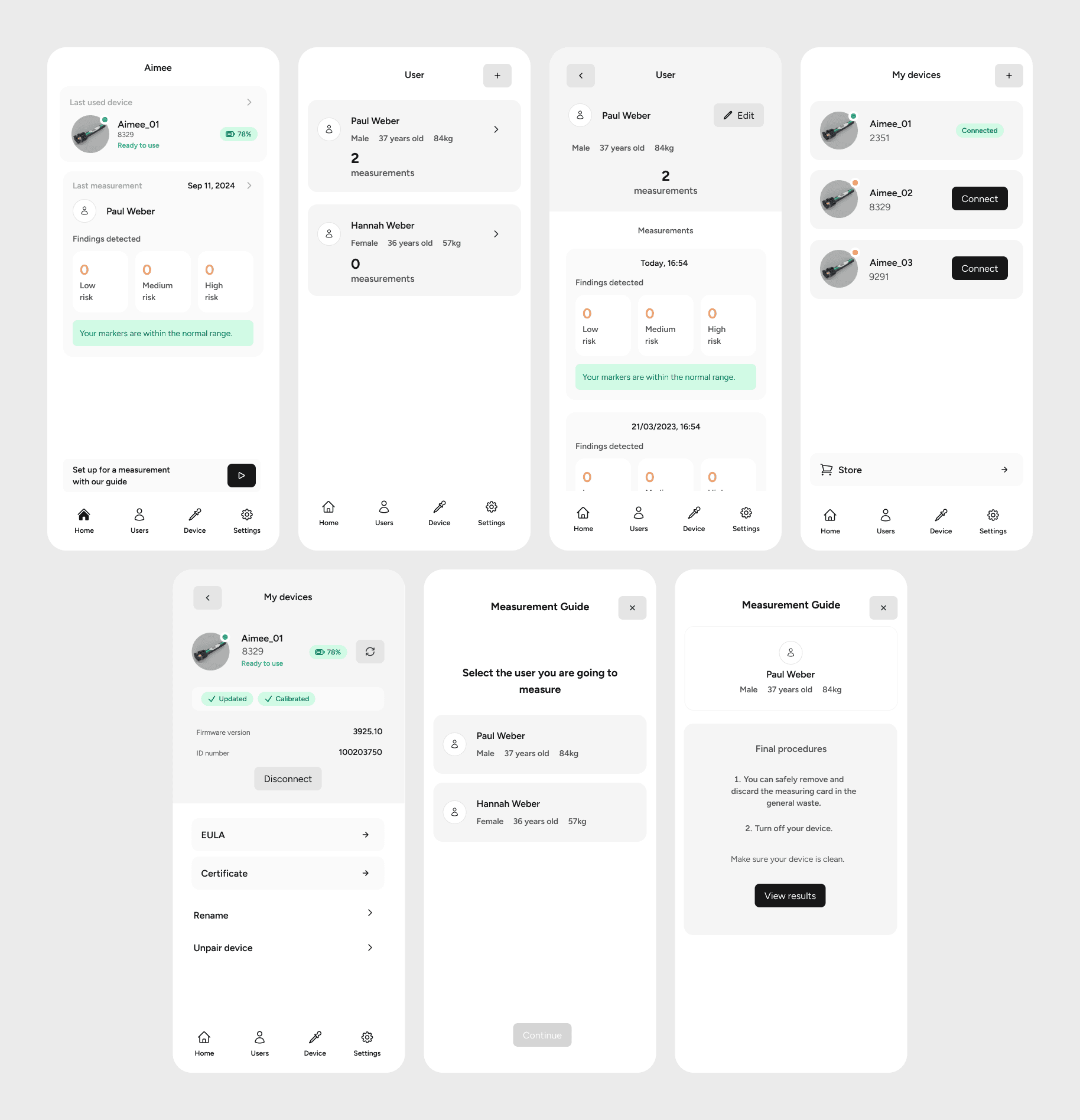 My role in this project was to design a mobile application that manages the Aimee medical device and its measurements. This included shaping the user experience, defining workflows, structuring information, and designing a clear and trustworthy interface for medical data.