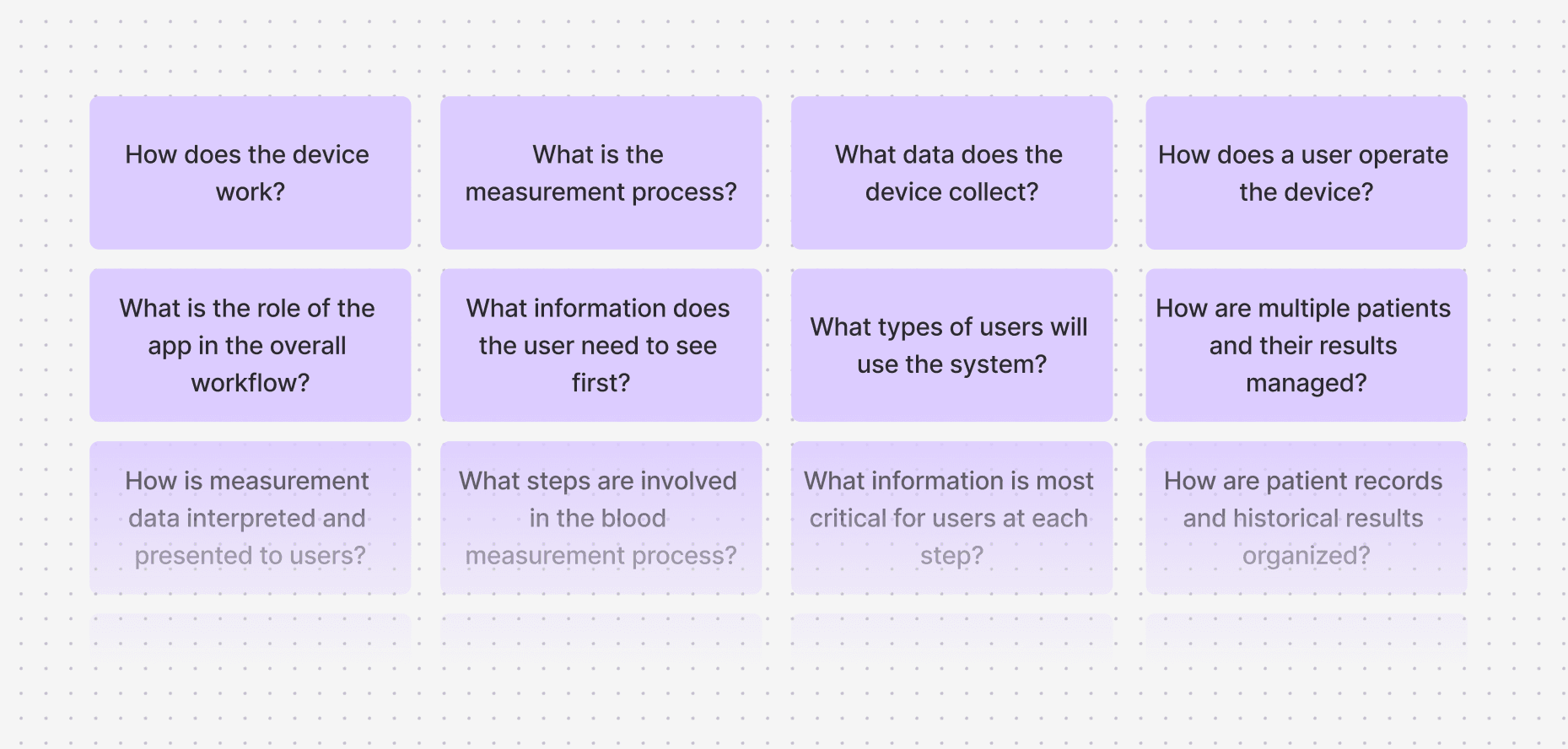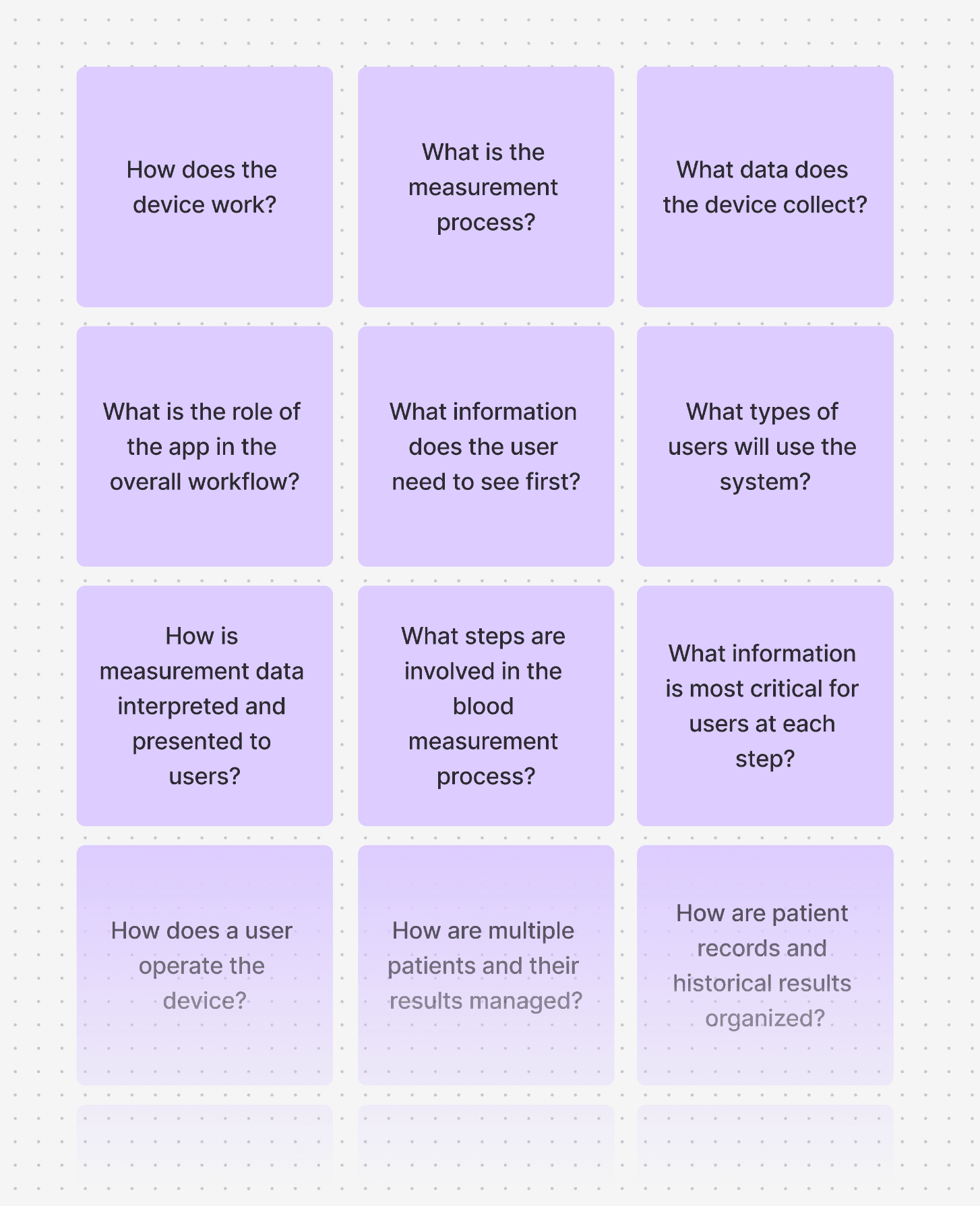 To fully understand the product and expectations, I prepared a structured set of questions for the client. These focused on device operation, user types, data interpretation, and key priorities for the app. This step ensured that design decisions were based on real product requirements rather than assumptions.