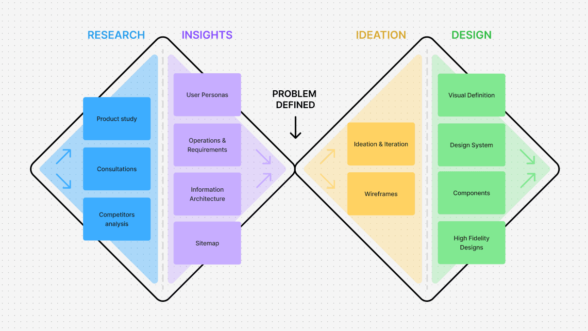 I followed the Double Diamond design process, moving through four main phases: