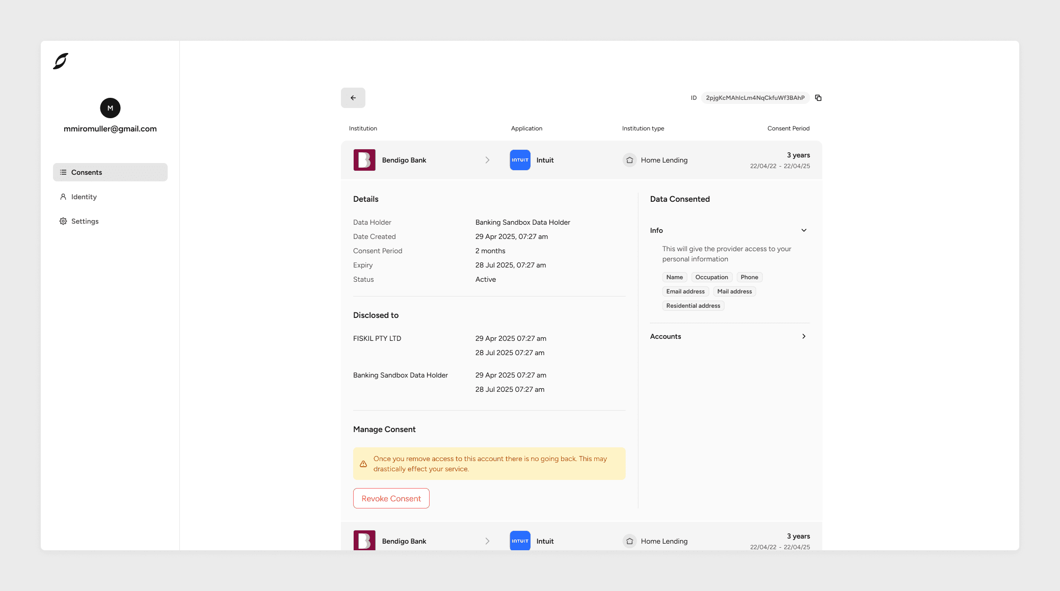A detailed view of a single consent, showing its status, related accounts, and key information.