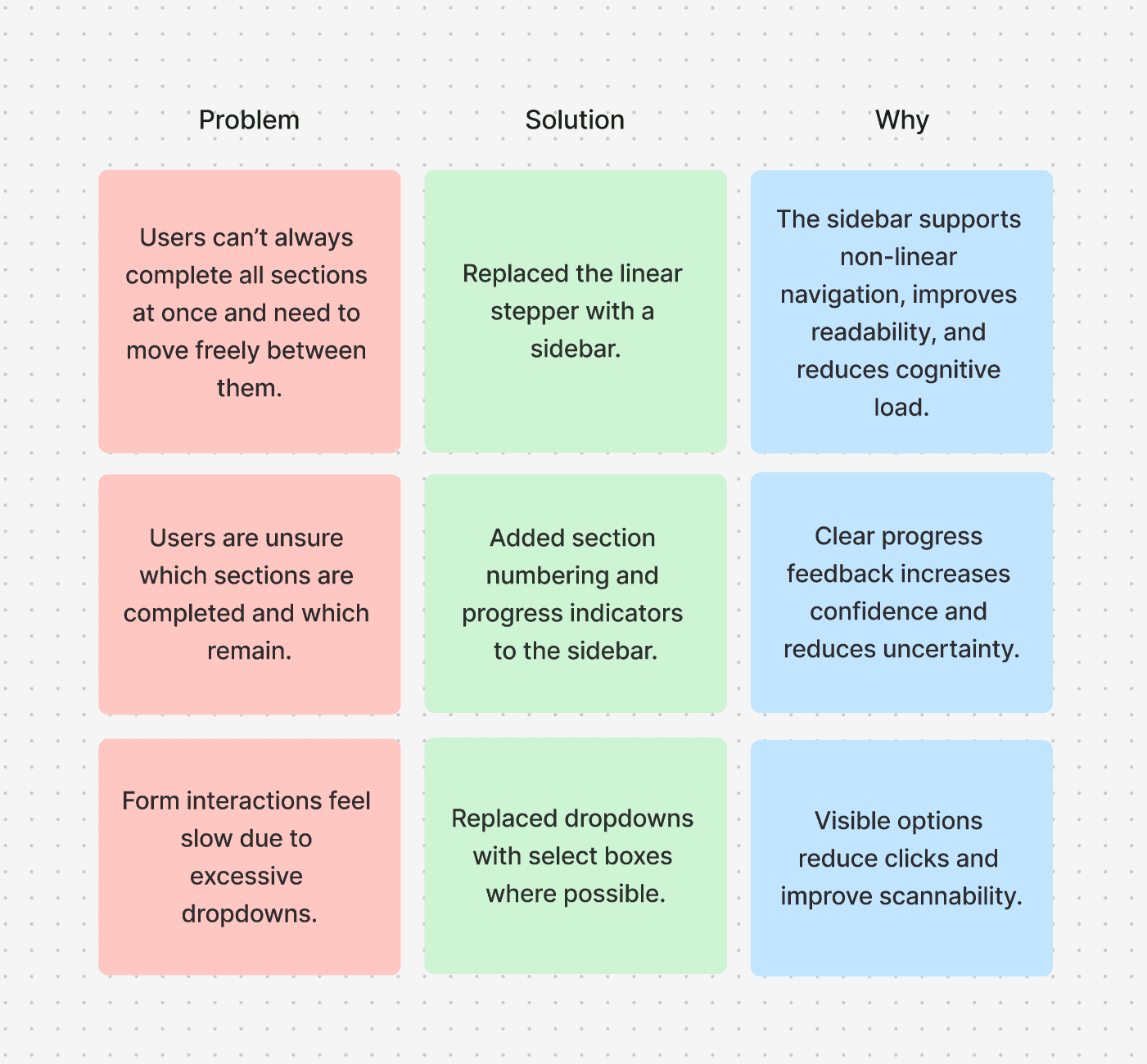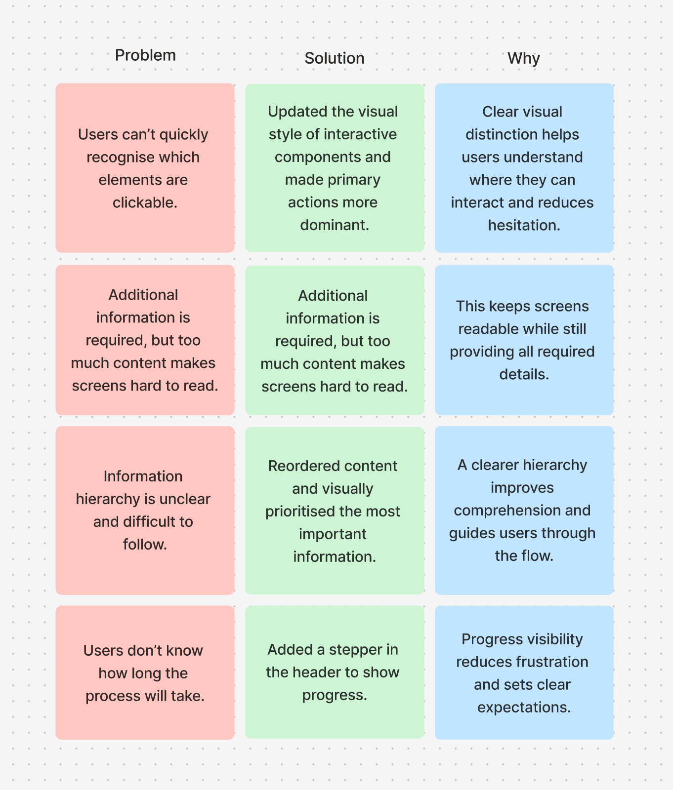 Below are 4 examples of day-to-day tasks from this project. The work involved redesigning existing interfaces, analysing usability issues, and proposing improved design solutions.