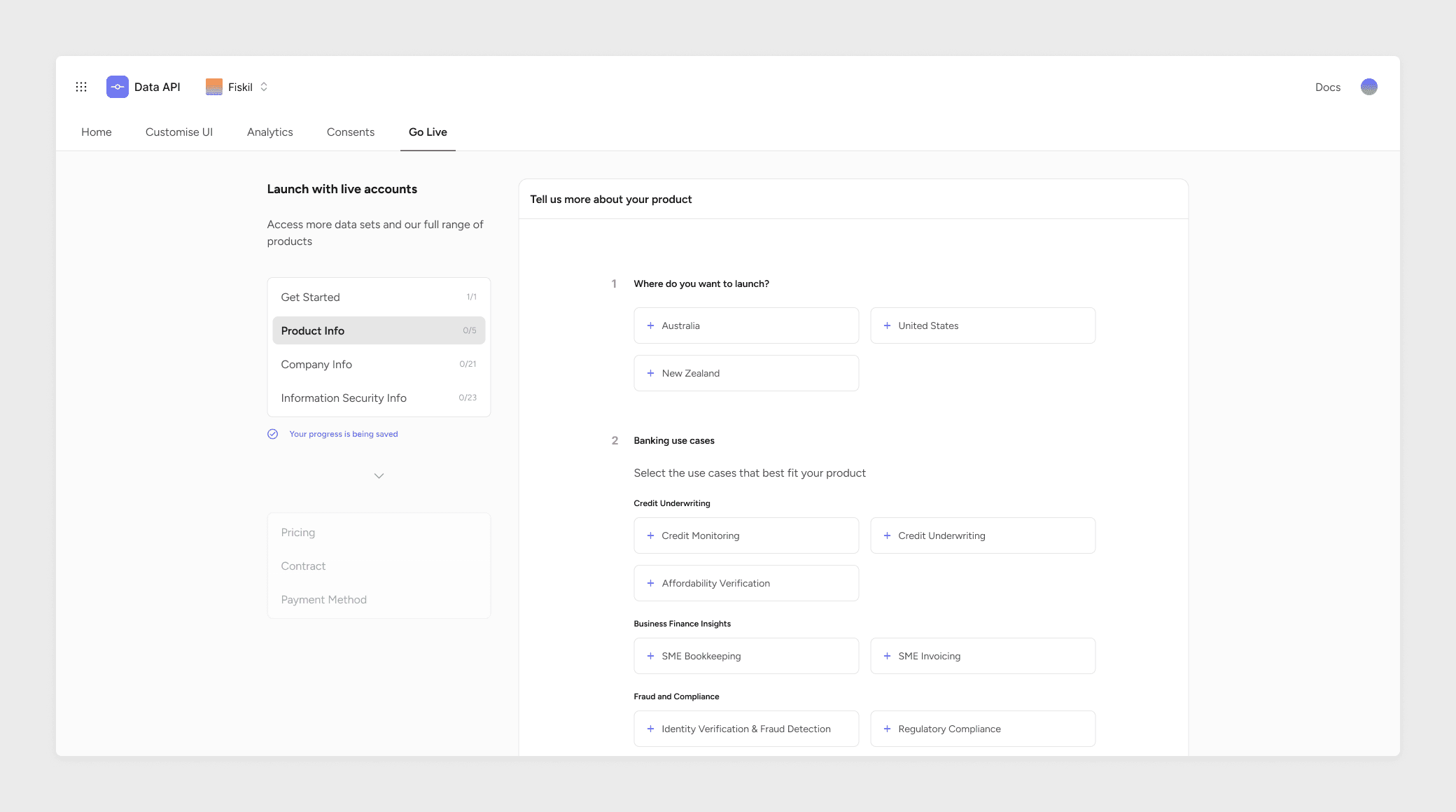 Fiskil.com is a B2B SaaS platform that enables businesses to securely access and manage financial data. The product helps companies connect to banks, handle user permissions, and stay compliant with regulatory requirements through a single console.